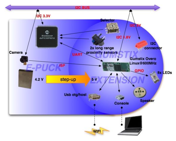 This introductory section explains the minimal procedures needed to work with the Gumstix Overo computer-on-module (COM) mounted on the e-puck extension board and gives a general overview of the available demos and scripts shipped with the micro sd. You can also refer to [ | This introductory section explains the minimal procedures needed to work with the Gumstix Overo computer-on-module (COM) mounted on the e-puck extension board and gives a general overview of the available demos and scripts shipped with the micro sd. You can also refer to [https://projects.gctronic.com/Gumstix/extension-instructions.pdf extension-instructions] that is a document containing the most important information in order to start working with the extension. The extension is mostly an interface between the e-puck robot and the Gumstix Overo COM. | ||