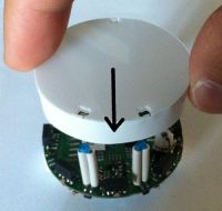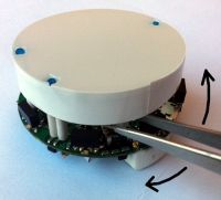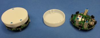 * the top light diffuser and robot are designed to lock together, but the diffuser isn't fixed and can thus be removed as desired; the top light diffuser, as the name suggests, helps the light coming from the RGB led to be smoothly spread out, moreover the strip attached around the diffuser let the robot be better detected from others robots. Once the top light diffuser is removed, pay attention not to look at the RGB led directly. In order to remove the top light diffuser simply pull up it, then to place it back on top of the robot remember to align the 3 holes in the diffuser with the 3 IRs emitters and push down carefully untill the diffuser is stable; pay attention to not apply too much force on the IRs emitters otherwise they can bend and stop working. | * the top light diffuser and robot are designed to lock together, but the diffuser isn't fixed and can thus be removed as desired; the top light diffuser, as the name suggests, helps the light coming from the RGB led to be smoothly spread out, moreover the strip attached around the diffuser let the robot be better detected from others robots. Once the top light diffuser is removed, pay attention not to look at the RGB led directly. In order to remove the top light diffuser simply pull up it, then to place it back on top of the robot remember to align the 3 holes in the diffuser with the 3 IRs emitters and push down carefully untill the diffuser is stable; pay attention to not apply too much force on the IRs emitters otherwise they can bend and stop working. | ||