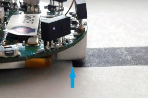 * when the top light diffuser is fit on top of the robot, then in order to change the selector position you can use the tweezers; the selector is located near the front-left IR emitter, as shown in the following figure: | * when the top light diffuser is fit on top of the robot, then in order to change the selector position you can use the tweezers; the selector is located near the front-left IR emitter, as shown in the following figure: | ||