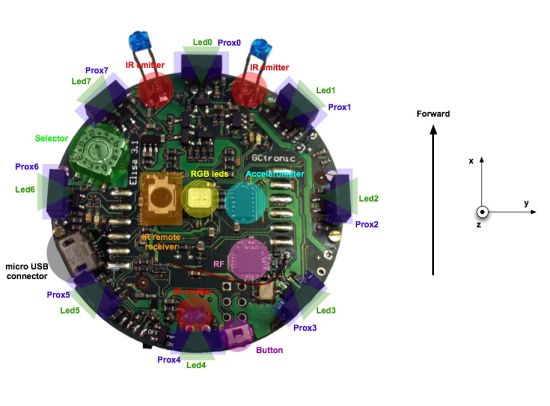 Elisa-3 is an evolution of the [ | Elisa-3 is an evolution of the [https://www.gctronic.com/doc/index.php/Elisa Elisa] robot based on a different microcontroller and including a comprehensive set of sensors: | ||