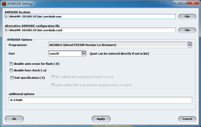 |C/C++ programming with the AVR-GCC compiler ([ | |C/C++ programming with the AVR-GCC compiler ([https://winavr.sourceforge.net/ WinAVR] for Windows). Free compiler and IDE (AVR Studio / Arduino) | ||