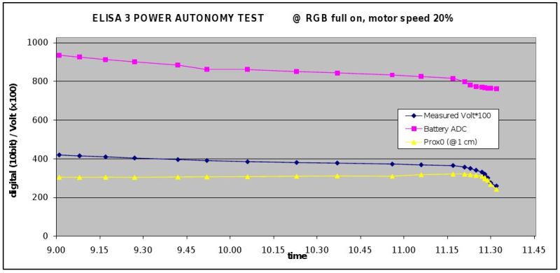 The robot is equipped with two batteries for a duration of about 3 hours at normal usage (motors run continuously, IRs and RGB leds turned on). | The robot is equipped with two batteries for a duration of about 3 hours at normal usage (motors run continuously, IRs and RGB leds turned on). | ||