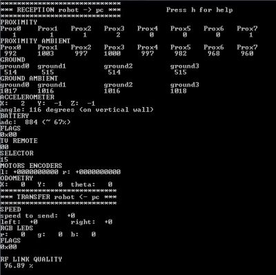 - use the infrared sensors to exchange data, thus during reception/transmission the proximity sensors cannot be used to avoid obstacles; in the worst case (continuous receive and transmit) the sensor update frequency is about 3 Hz