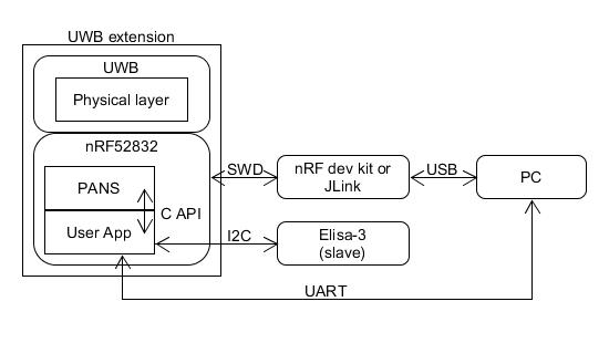 On the nRF52832 the firmware is developed using the C API based on the PANS stack released by Decawave. The communication with the Elisa-3 robot is accomplished through I2C (the robot is the slave). The nRF52 is programmed/debugged through the SWD interface using an external nRF dev kit attached to the computer via USB. An additional UART is attached to the UWB module in order to get logging info. | On the nRF52832 the firmware is developed using the C API based on the PANS stack released by Decawave. The communication with the Elisa-3 robot is accomplished through I2C (the robot is the slave). The nRF52 is programmed/debugged through the SWD interface using an external nRF dev kit attached to the computer via USB. An additional UART is attached to the UWB module in order to get logging info. | ||