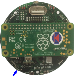 A button is available to reset the robot, when pressed it will resets only the robot restarting its firmware. This is useful for instance during development or for specific demos in which a restart of the robot is needed. In these cases you don't need to turn off completely the robot (and consequently also the Pi-puck if energy is supplied by the robot) but instead you can simply reset the robot. The position of the reset button is shown in the following figure: